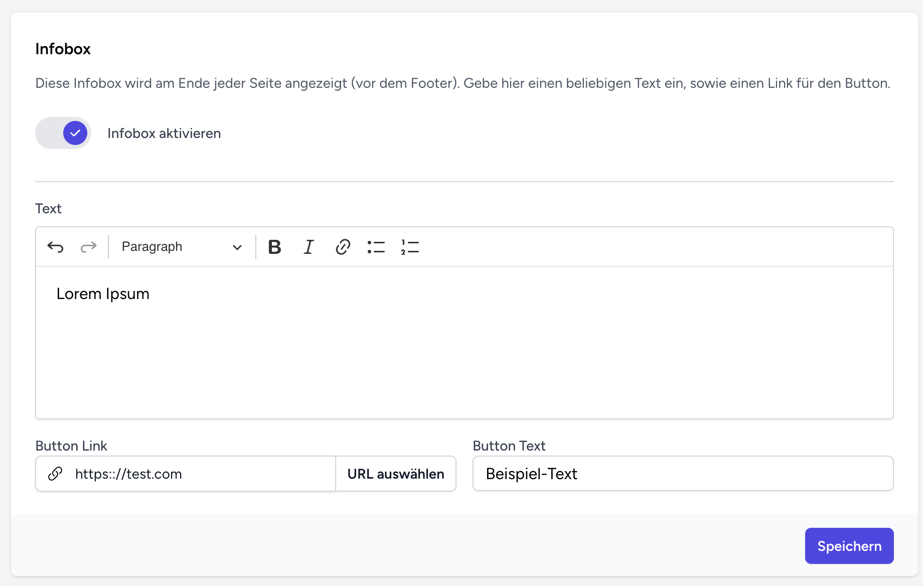 Die Infobox wird über dem Footer in einem eigenen Kasten ausgegeben, welcher auf jeder Seite angezeigt wird.