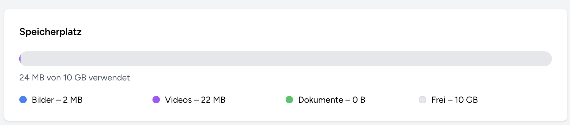Aus technischen Gründen wird eine Speicherplatz-Limitierung verwendet. Für den derzeitigen Zeitpunkt ist ein Limit von 10 GB eingestellt. Bei dem Hochladen von Medien wird darüber hinaus eine Konvertierung von Bild- und Film-Dateien durchgeführt und eine Upload-Begrenzung festgelegt.