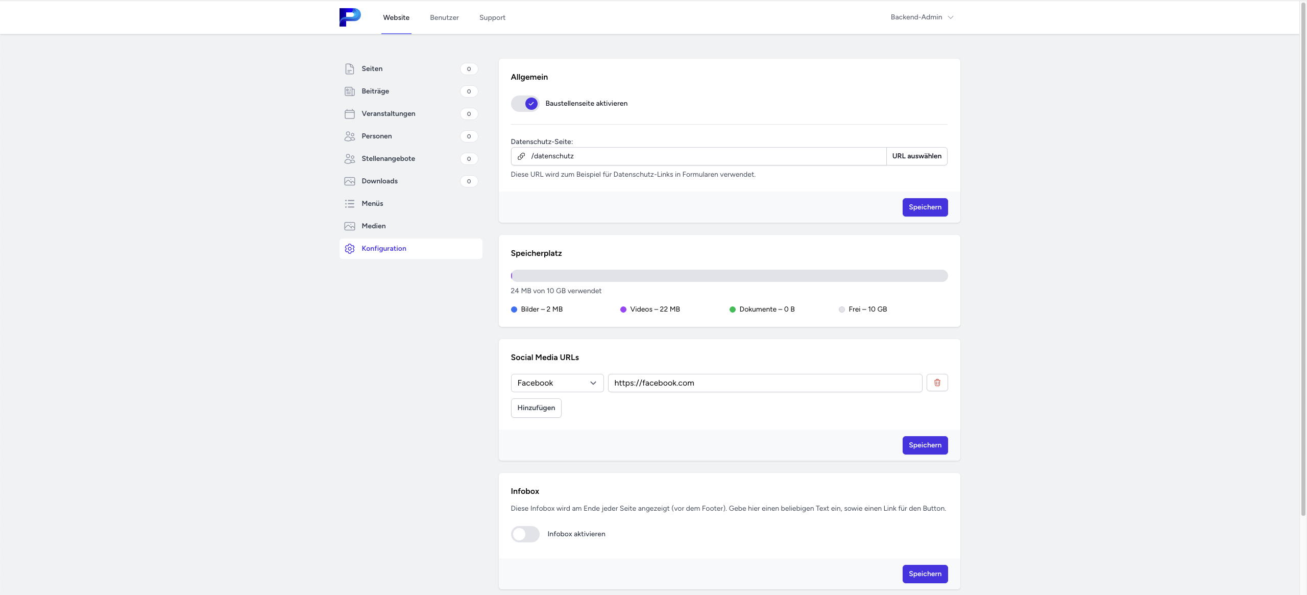 Im Konfigurations-Reiter finden sie mehrere Einstellungen für den gesamten Webauftritt.
