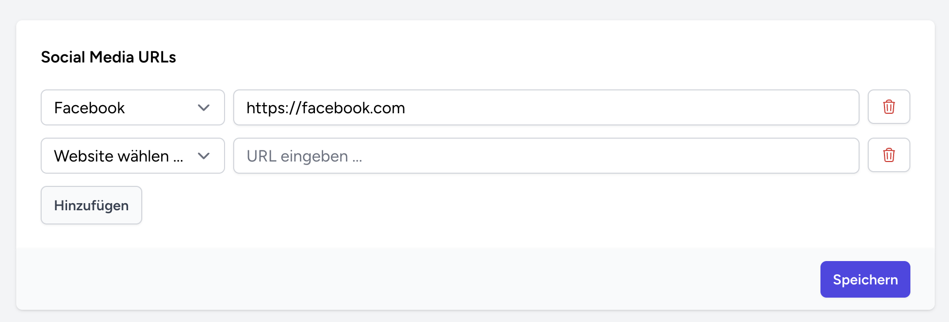 Hier können Sie ihre Social-Media-Kanäle hinterlegen. Diese werden auf der Webseite mit den entsprechenden Icons im Footer-Bereich angezeigt.