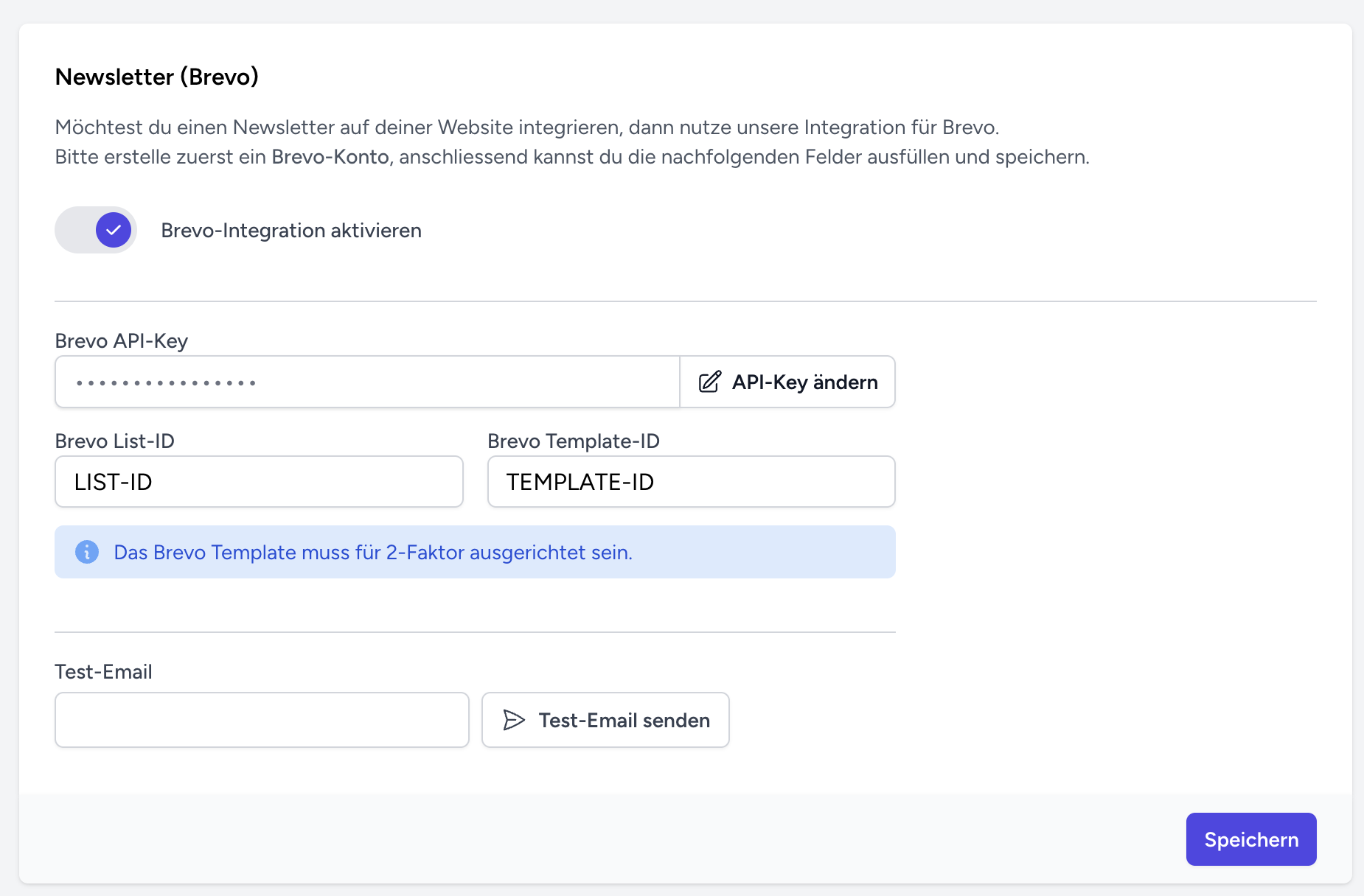 Die Brevo-Anbindung ist für die Newsletter-Anmeldung konzipiert. Hier können Sie die Zugangsdaten von Brevo eintragen und dann eine Newsletter-Anmeldung auf der Webseite anzeigen.